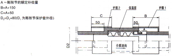 安裝直埋式膨脹節(jié)(不包括一次性直埋式)安裝時應有兩個后年度護圈(如下圖),且護圈的壁厚不應小于管道的壁厚,設置護圈1的目的是為管道受熱膨脹時,A尺寸范圍內有土、砂等進入,圖中的各尺寸